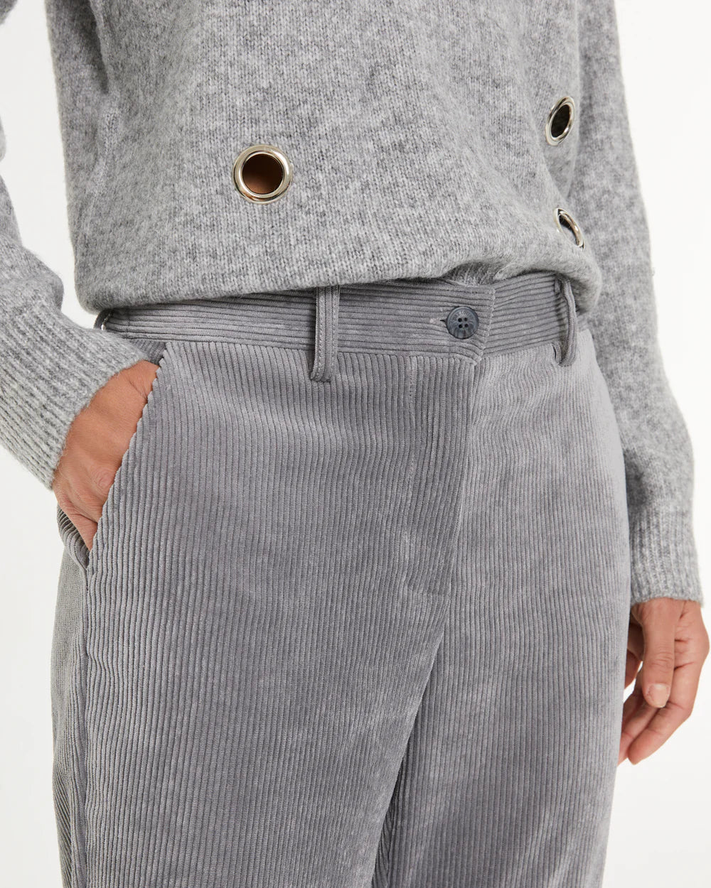 Straight-leg corduroy trousers with turned-up hems. Front side pockets. Zip and button closure. Elastic waistband at the back for added comfort.