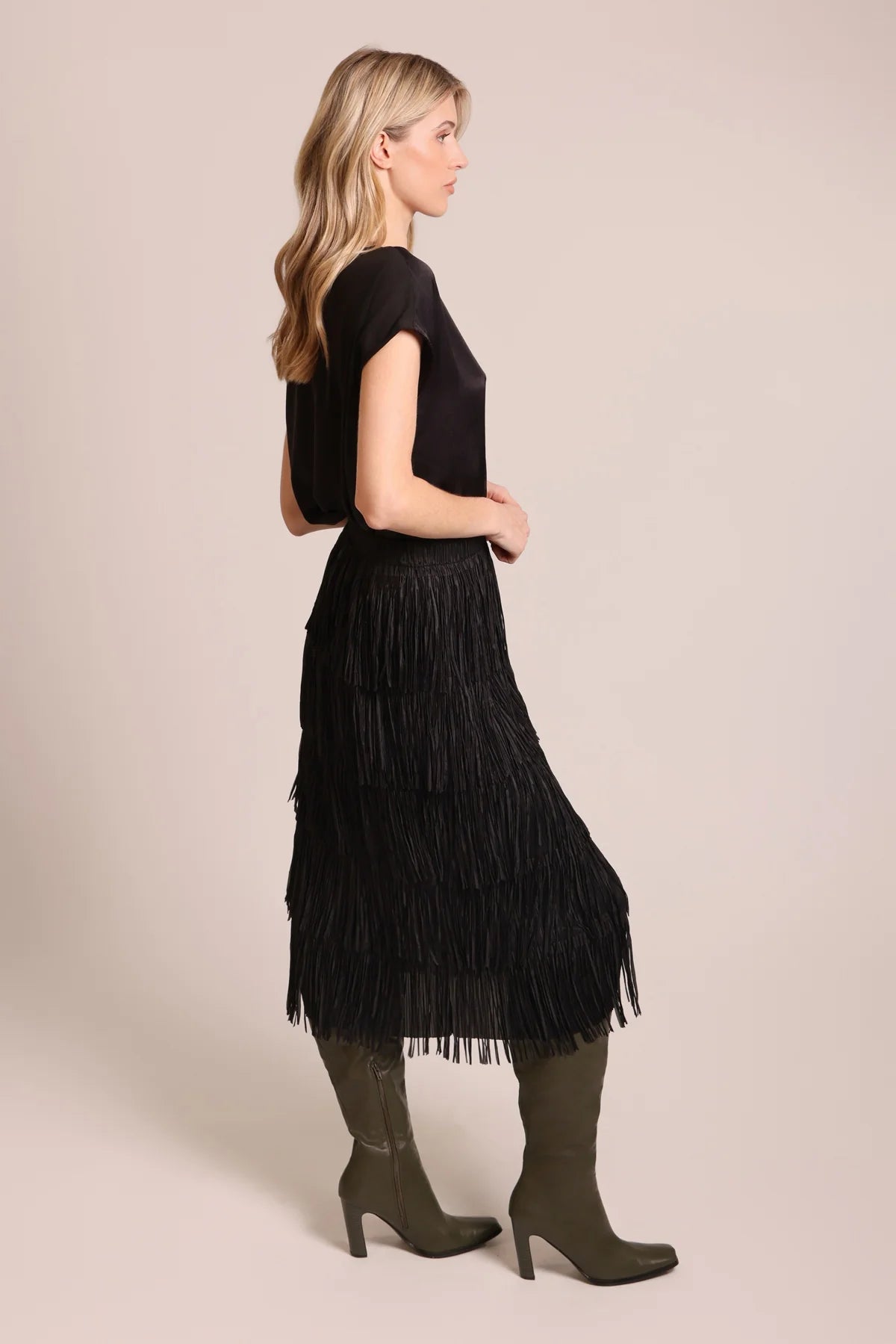 Add a touch of Flapper energy to your wardrobe with our Gloria skirt. A beautiful black tiered fringe midi skirt, with a stretch waistband for added comfort. Style with a black top and some knee high boots for a stunning Autumn outfit.