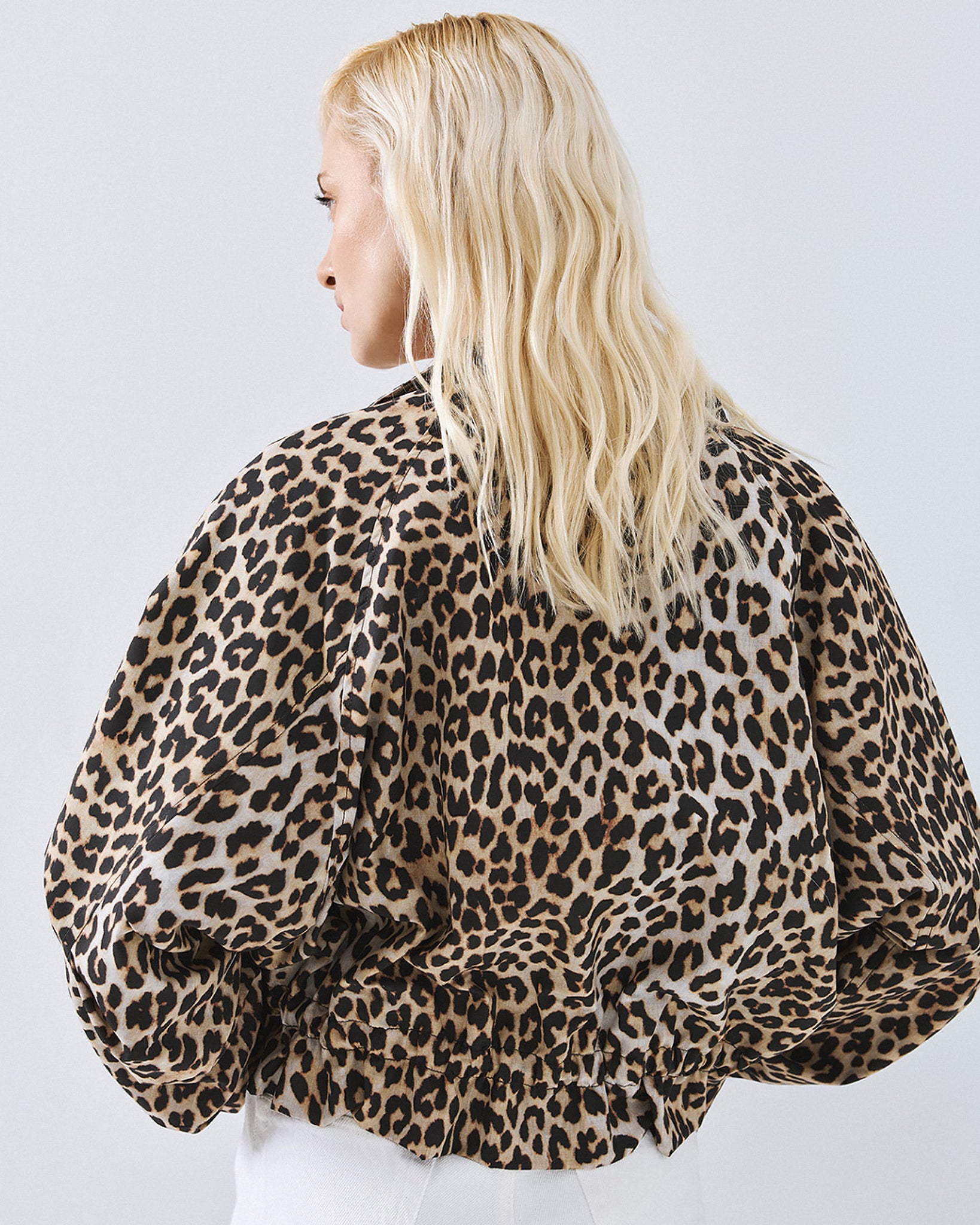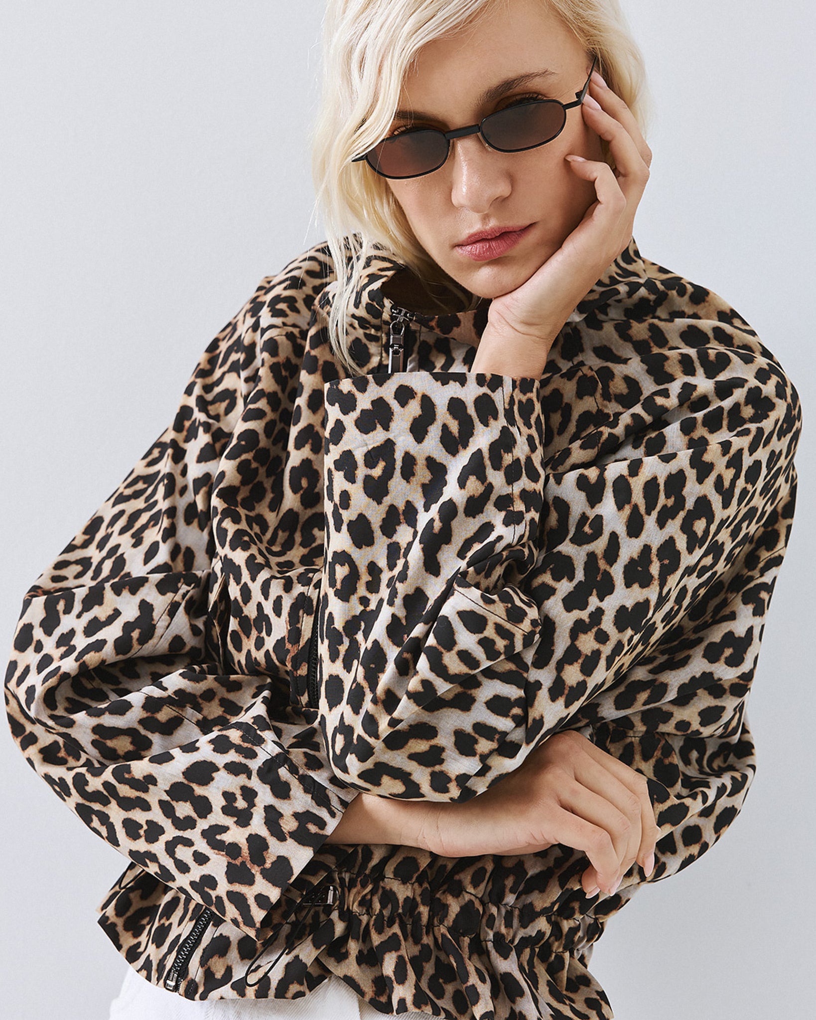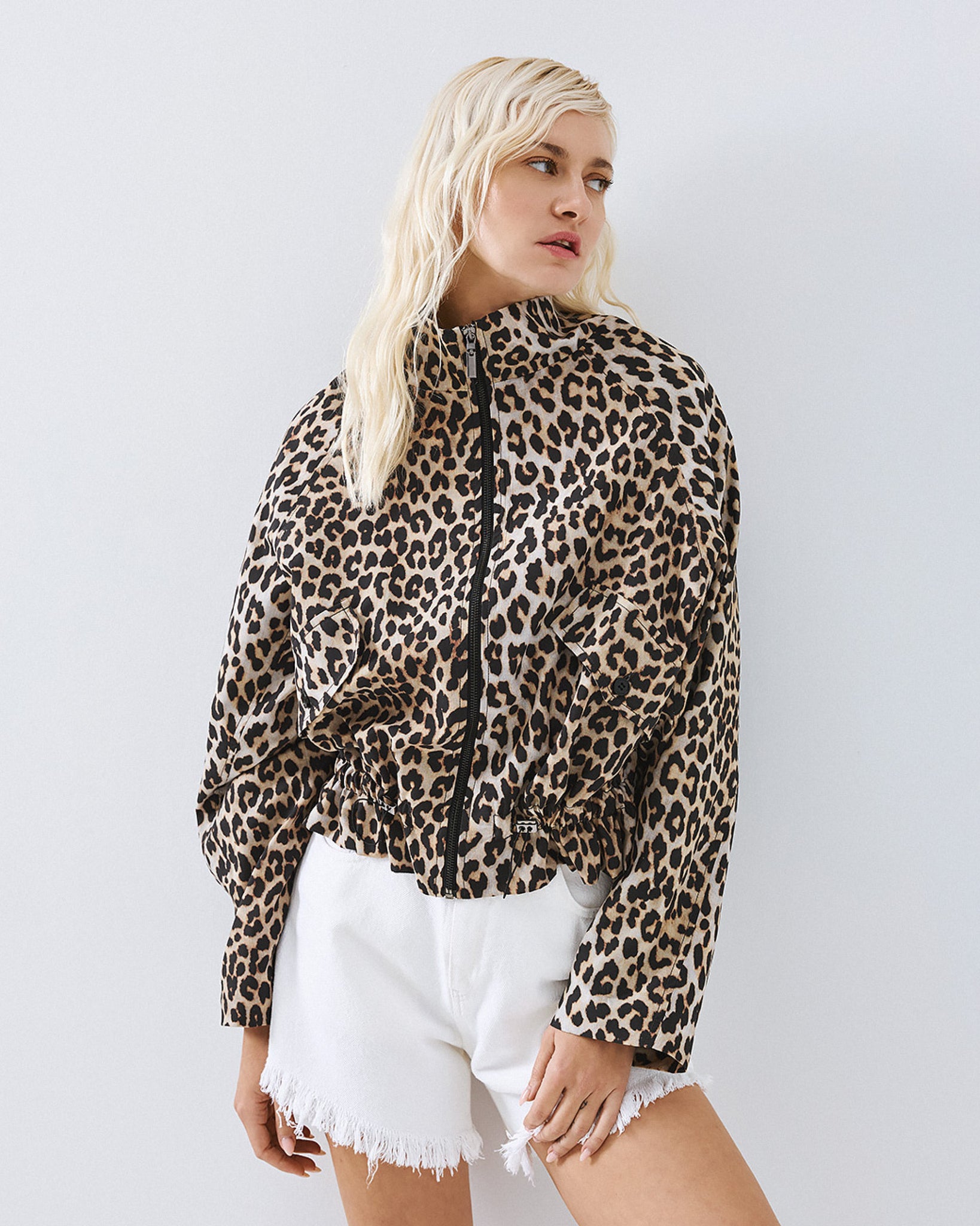 Leopard-print bomber jacket with a high neckline and long barrel sleeves. Features side flap pockets, adjustable drawstrings at the waist and a front zip closure.