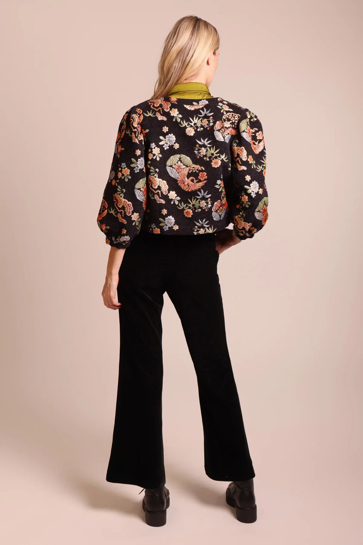 This cropped jacket features a stylish boxy fit and eye-catching puffy sleeves, designed to elevate your look effortlessly. Adorned with beautiful floral metallic embroidery, it adds a subtle shimmer, perfect for brightening your everyday autumn and winter outfits. With no fastenings, it offers easy layering and a relaxed vibe, making it a versatile and standout piece for the cooler seasons.
