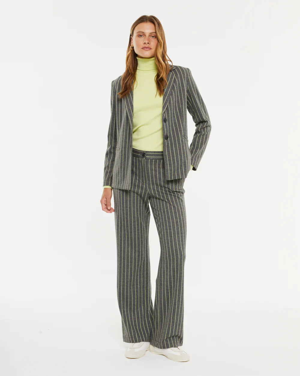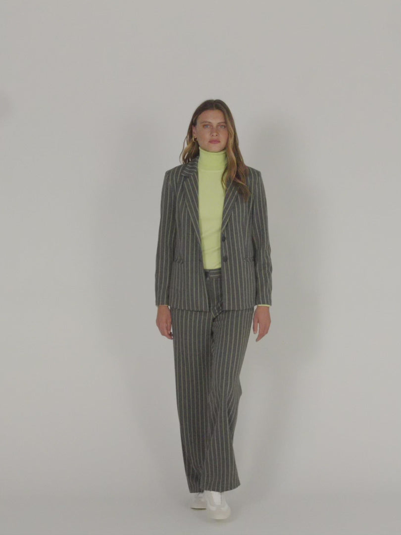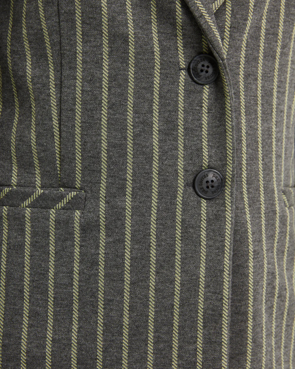 Pinstriped knit blazer with welt pockets. Lapel collar and two-button front closure. Pair it with the matching trousers for a perfect look. Regular fit.