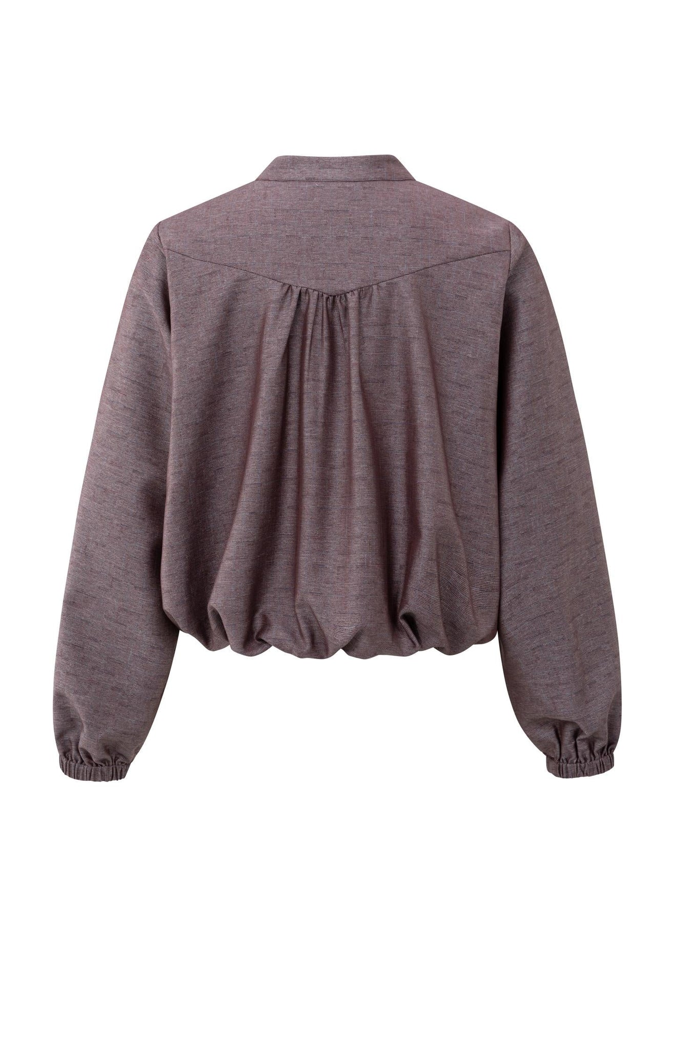 This stylish blouse jacket features a balloon-shaped silhouette with a gathered waistband and cuffs. Crafted from a soft, structured fabric, it offers a relaxed fit with subtle pleats at the shoulders for a feminine touch. The concealed button closure and stand-up collar complete the minimal yet elegant design. The model is 173 cm and wears size 36.