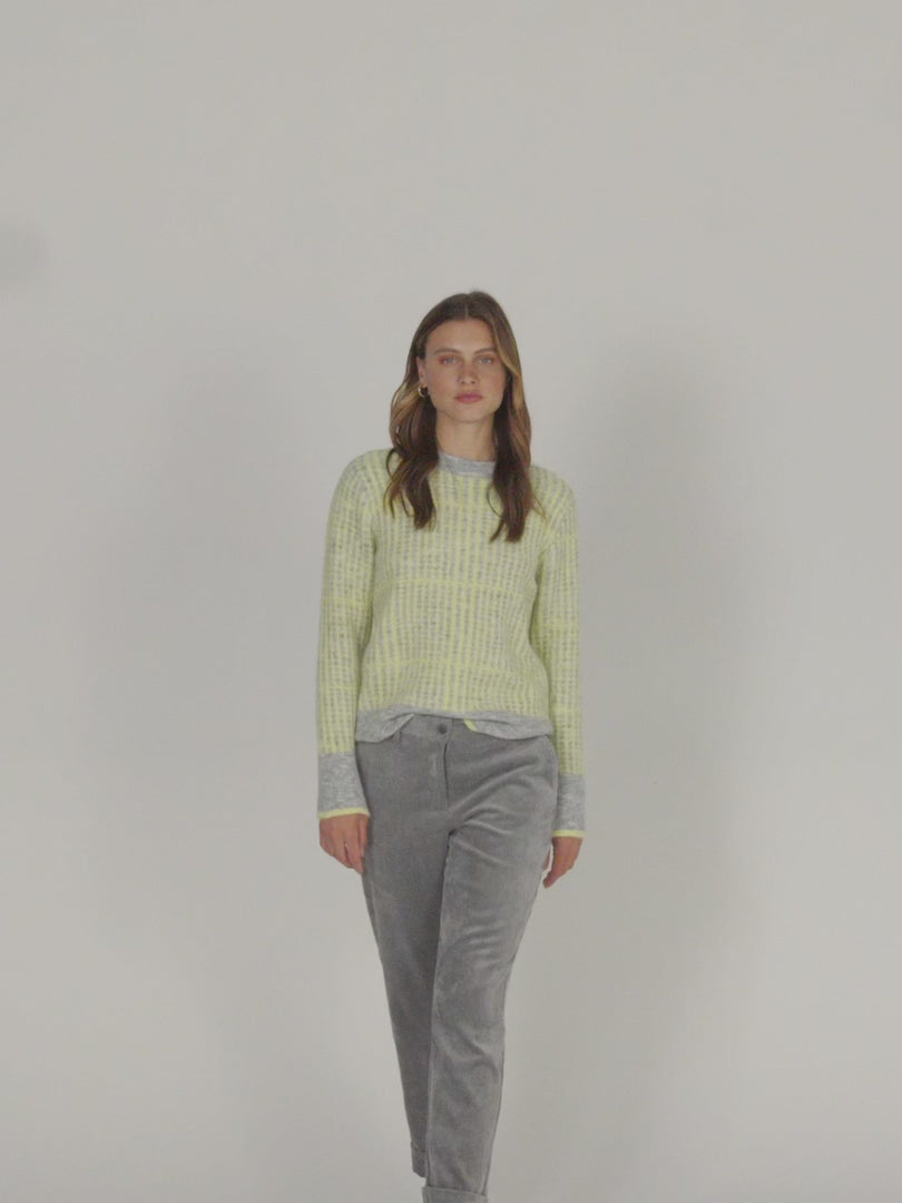 The PAZ TORRAS Stripe Sweater in grey and amarillo combines timeless style with luxurious comfort. Made from a super soft wool blend, it features a refined round neckline and deep cuffs that add subtle elegance. The distinctive striped pattern enhances its sophisticated appeal, making it a versatile piece for both casual and dressier occasions.