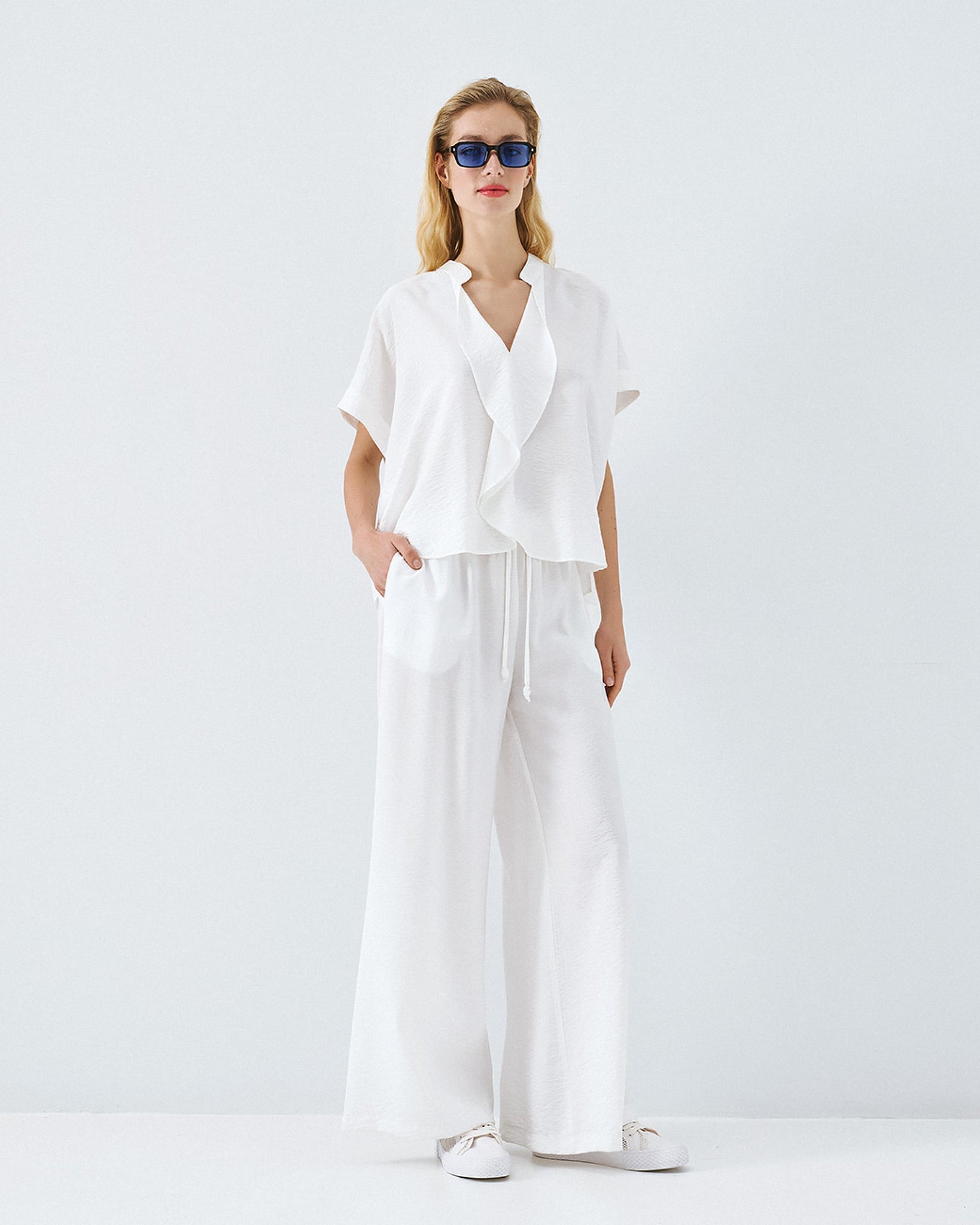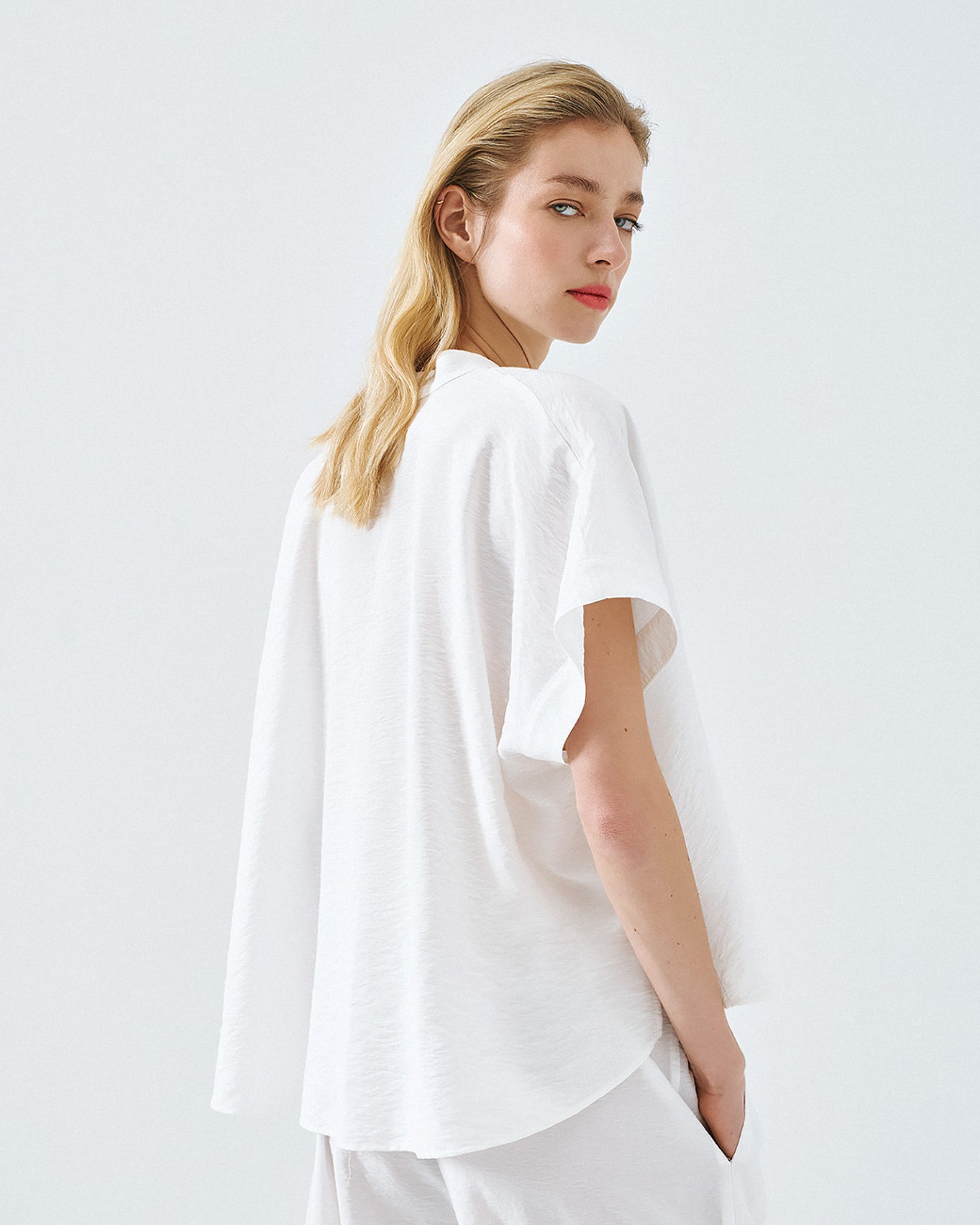 Blouse with short sleeves and a crinkled texture. Features a band collar, a V-neckline and a ruffled front detail.