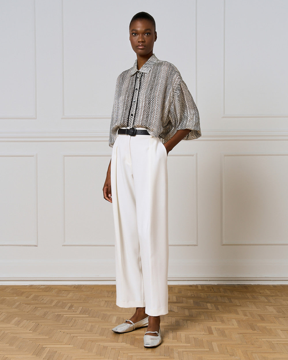 Cropped printed shirt with lurex details and a collar. It features long sleeves and fastens with buttons at the front and cuffs.