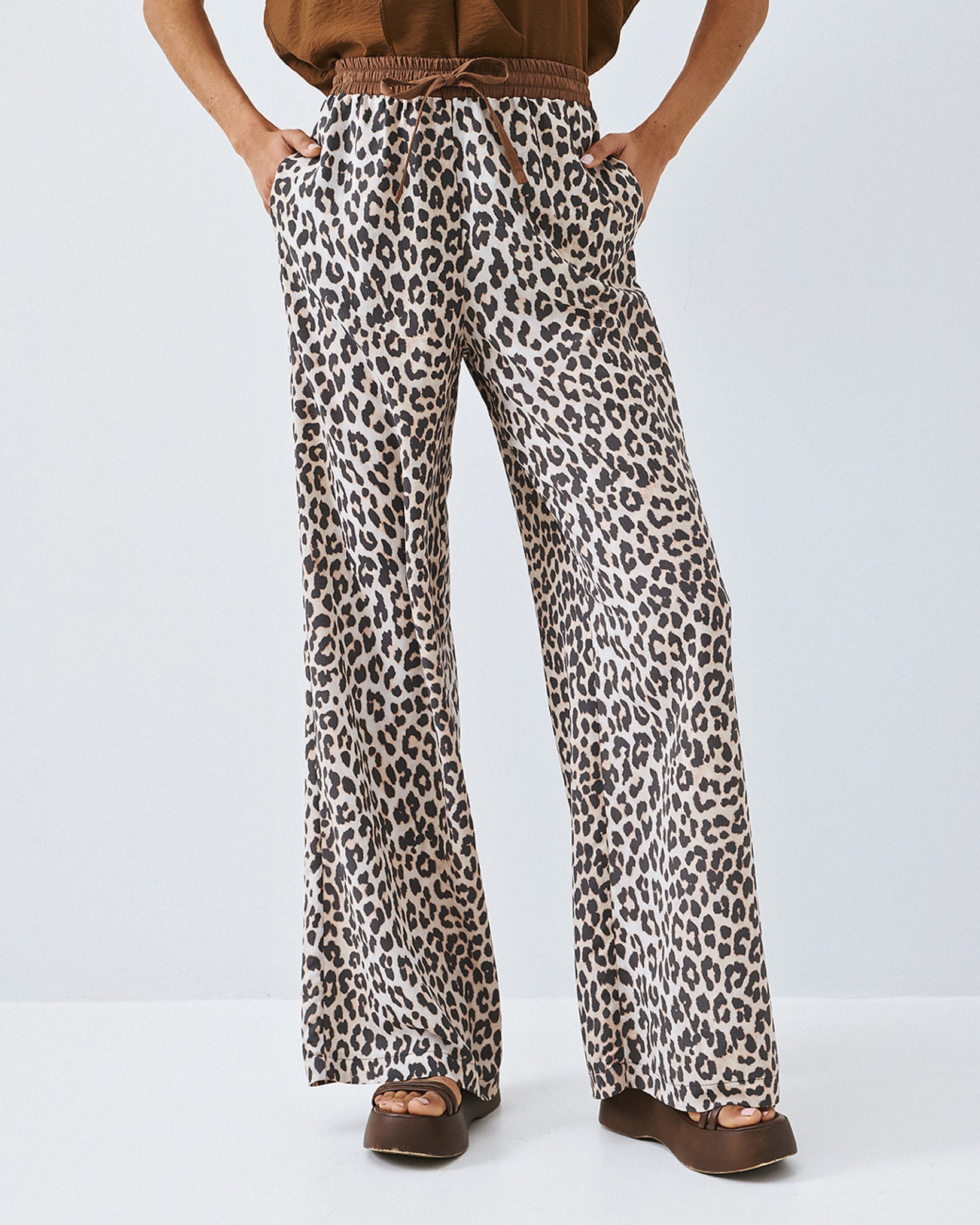 Elevate your casual wardrobe with these striking leopard print pants. Crafted from lightweight fabric, they offer effortless comfort without compromising on style. The straight leg silhouette provides a flattering, versatile fit that transitions seamlessly from day to evening. Practical side pockets keep essentials within reach, while the elasticated drawstring waist ensures a customizable fit. A rich contrast brown waistband adds a refined finishing touch, grounding the bold print with understated elegance. Wear with the matching jacket for a head turning ensemble.