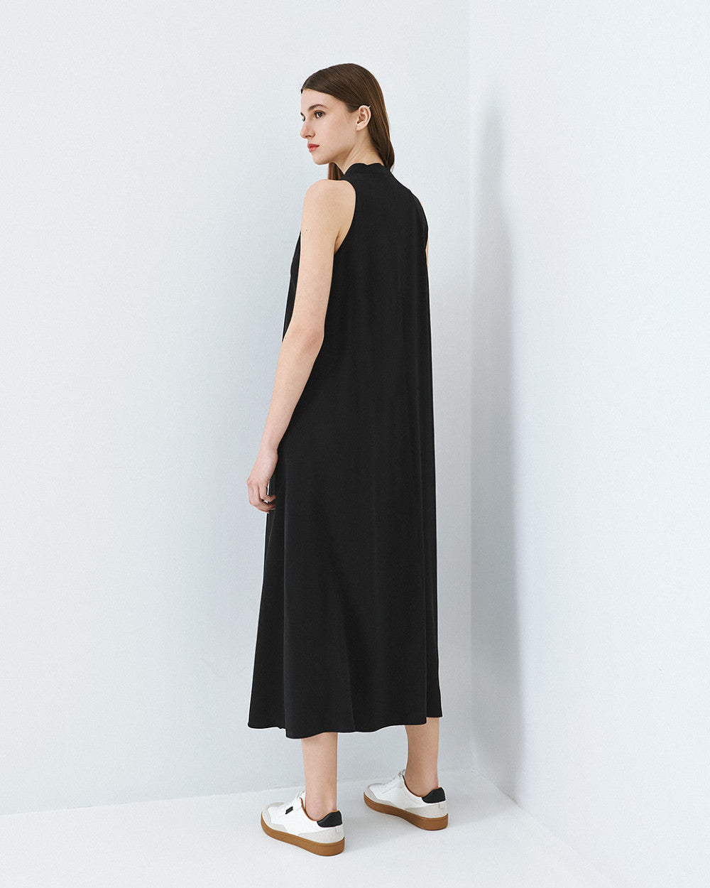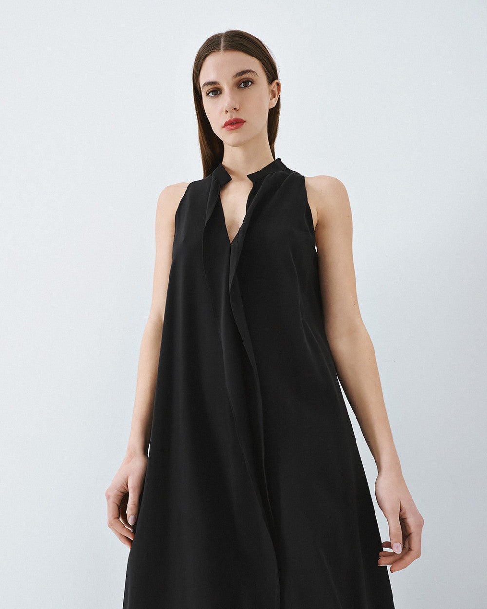 Elevate your evening wardrobe with this sophisticated black maxi dress. Featuring a flattering V-neckline and sleeveless design, it offers timeless elegance for any occasion. The cascading ruffle detail down the front adds movement and visual interest, creating a refined silhouette. Perfect for formal events, dinners, or special celebrations, this versatile piece transitions effortlessly from day to night styling.