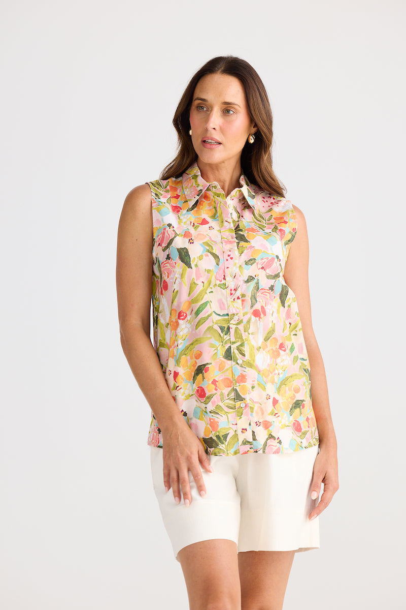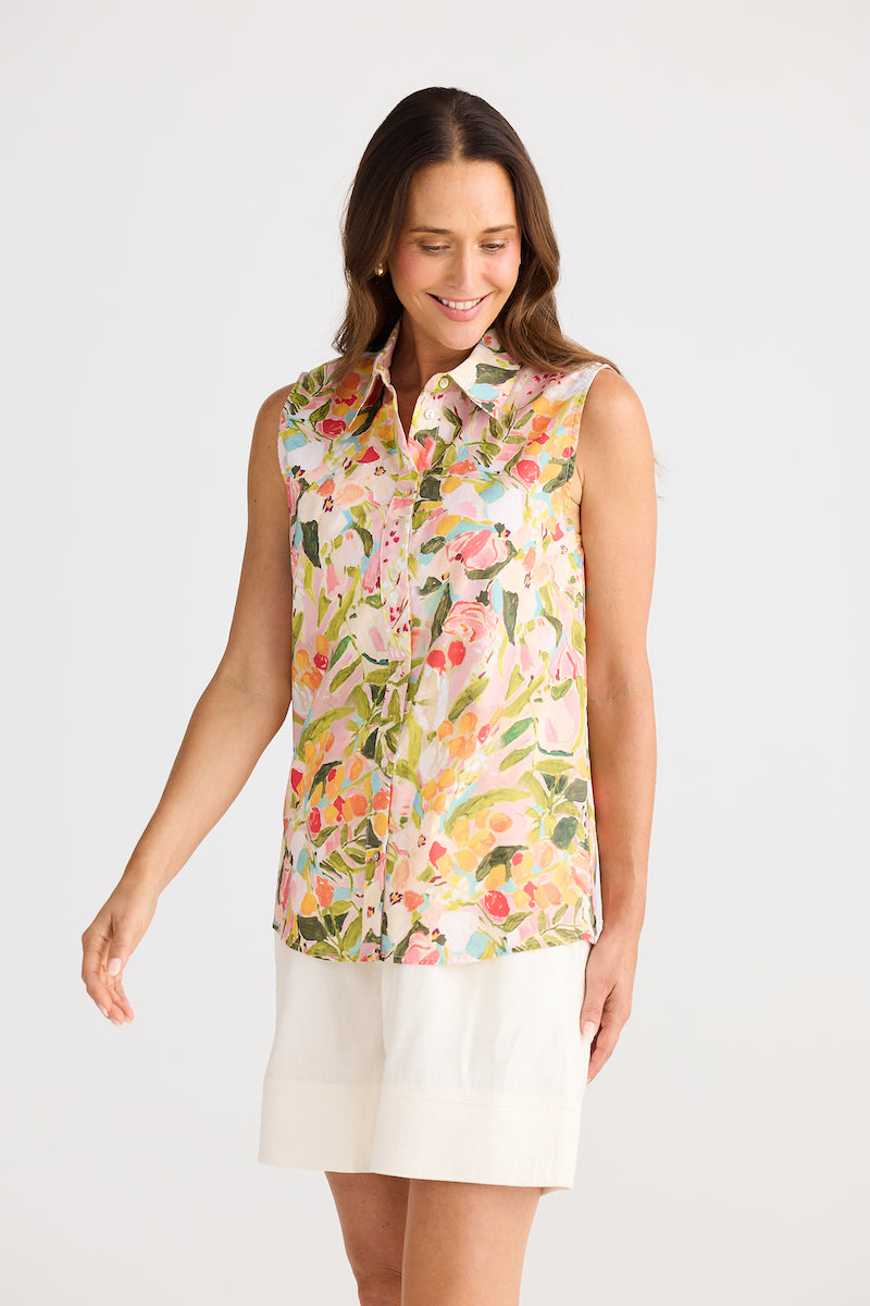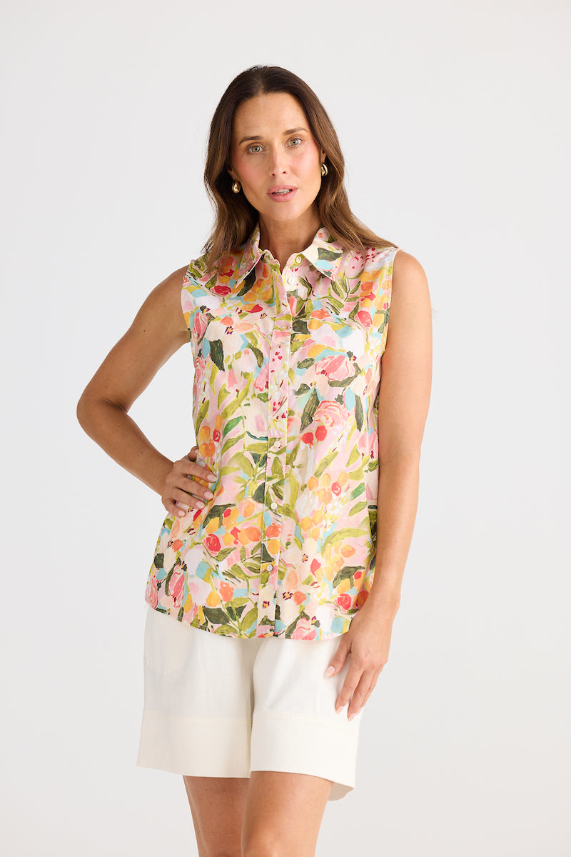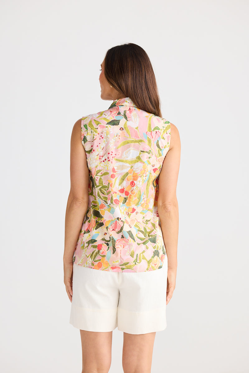 Effortless elegance meets timeless style with this sleeveless button-up shirt, crafted from soft cotton for all-day comfort. The classic collar and front button closure create a polished silhouette, while the vibrant floral print brings a fresh, garden-inspired charm to your wardrobe. Perfect paired with the matching skirt for a coordinated look that transitions seamlessly from casual outings to weekend gatherings. A versatile piece that celebrates feminine style with understated sophistication.