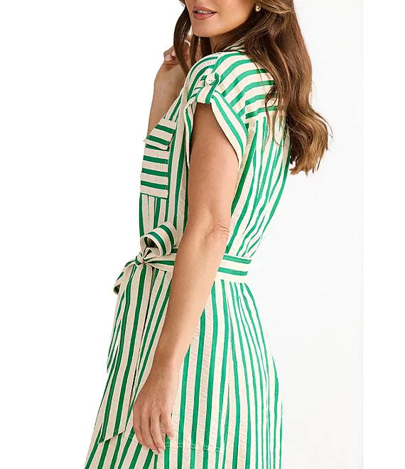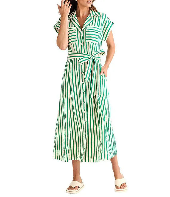 Elevate your everyday style with this sophisticated striped shirt dress in jade and white. Designed with a classic collar and front button fastening, it features practical chest patch pockets and side seam pockets for convenience. The cap sleeves with charming turn-ups add a vintage-inspired touch, while the tied belt cinches the waist beautifully. The flattering A-line skirt falls to midi length, creating an elegant silhouette perfect for work or weekend wear. A versatile piece that transitions effortlessly from day to night.