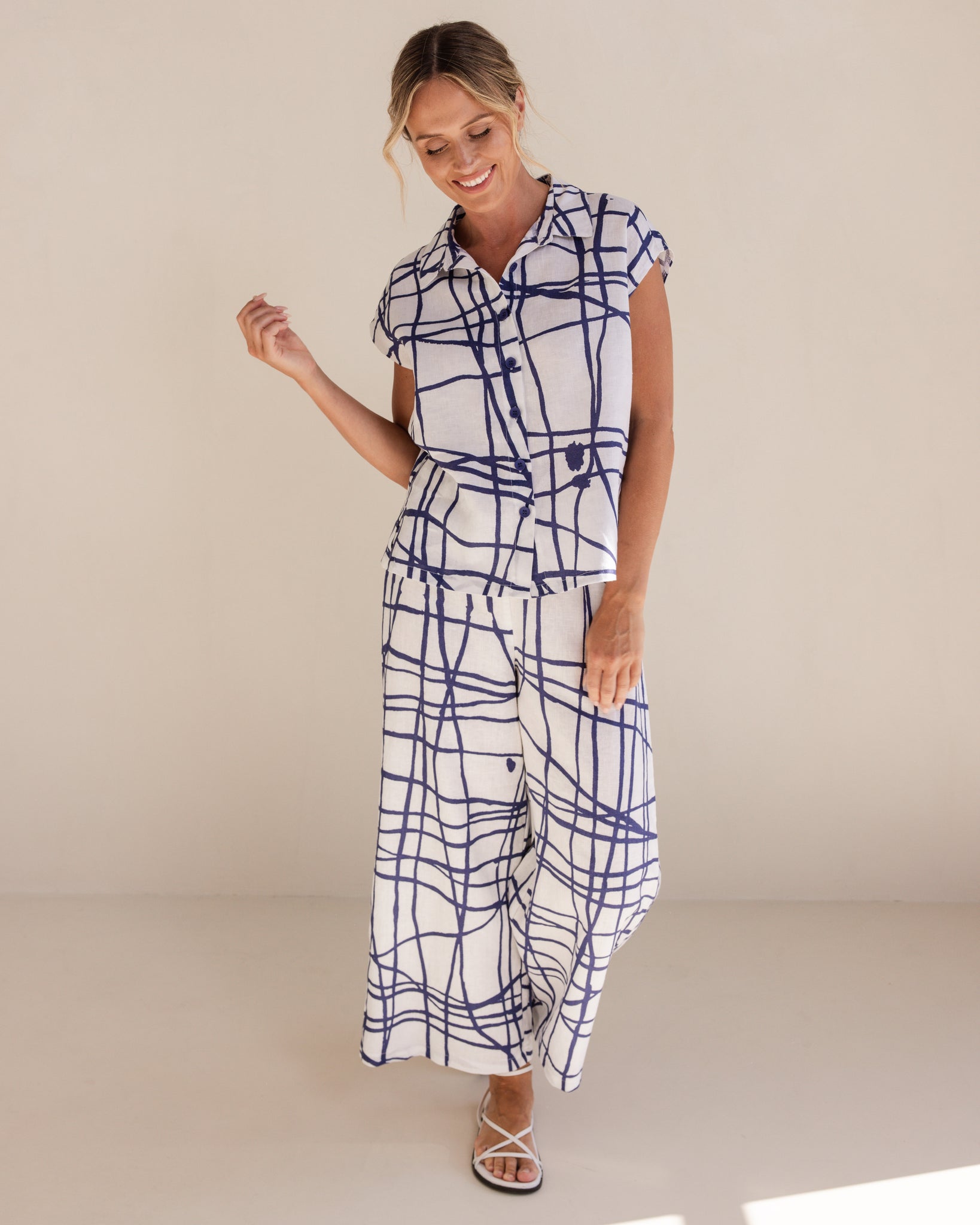 Elevate your wardrobe with these refined linen palazzo pants, crafted from premium French linen for exceptional breathability and natural elegance. The relaxed 7/8 length flatters effortlessly, whilst the distinctive side button fastening detail adds a touch of understated sophistication. The striking denim and white print brings visual interest to any ensemble, making these versatile trousers perfect for both casual outings and elevated occasions. Designed for those who appreciate quality craftsmanship and timeless style.