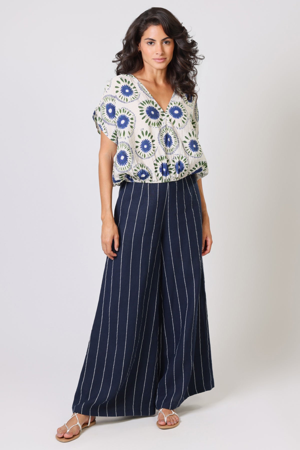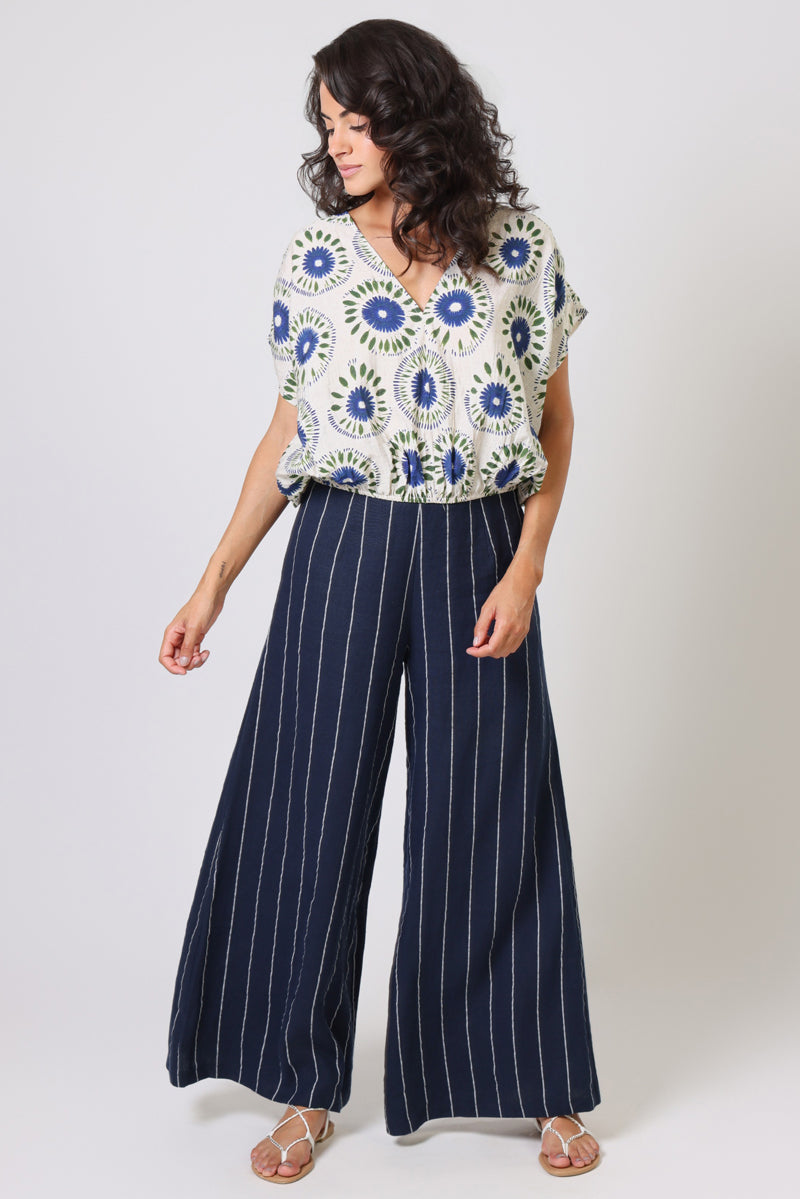 Effortlessly elegant, this Traffic People top channels vintage charm with its striking blue and green retro daisy print set against a cream backdrop. The relaxed silhouette features a flattering V-neckline and flowing kimono sleeves, while the elasticated waist provides gentle definition without constraint. Perfect for layering or wearing solo, this piece pairs seamlessly with the matching pants for a cohesive, curated look that transcends seasonal trends.