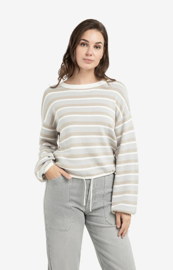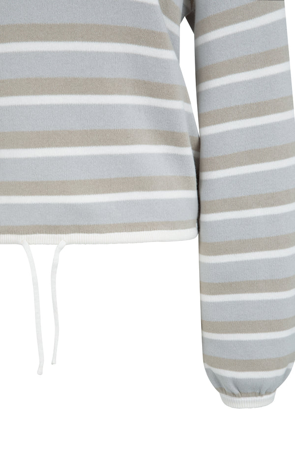 This knitted sweater features a playful stripe pattern in neutral tones. Designed with long balloon sleeves, a round neckline, and a loose fit. The hem is finished with a drawstring, allowing for a feminine, blousy silhouette. Crafted from a soft fabric for all-day comfort. The model is 178 cm and wears size S.