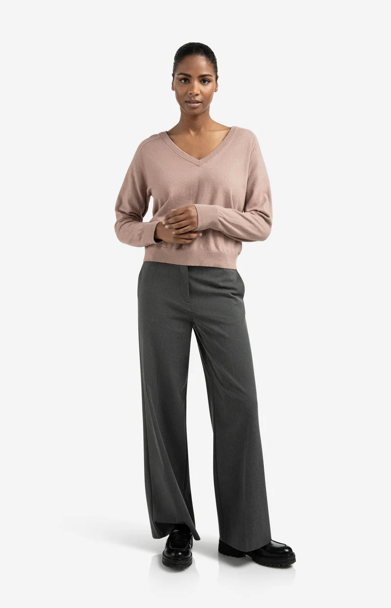 This soft sweater features a V-neckline at both the front and back, with a loose fit and long sleeves. A button closure at the back adds a refined and unexpected touch. Finished with wide ribbed cuffs and hem for comfort and style.