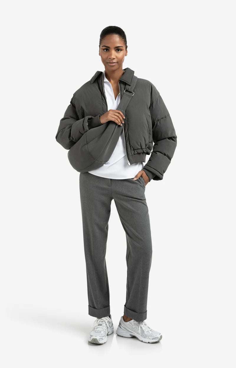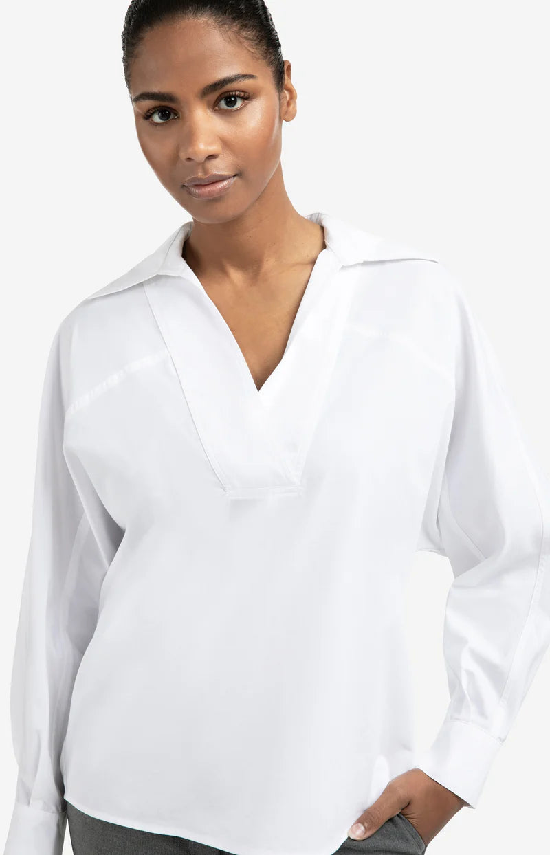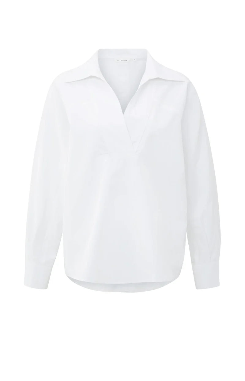 This crisp poplin blouse features a loose fit, long sleeves with cuffs, and a deep V-neck with a polo-style collar for a modern touch. The structured yet soft fabric adds a clean and polished look. A versatile piece that pairs easily with both denim and tailored trousers for a refined, everyday style.