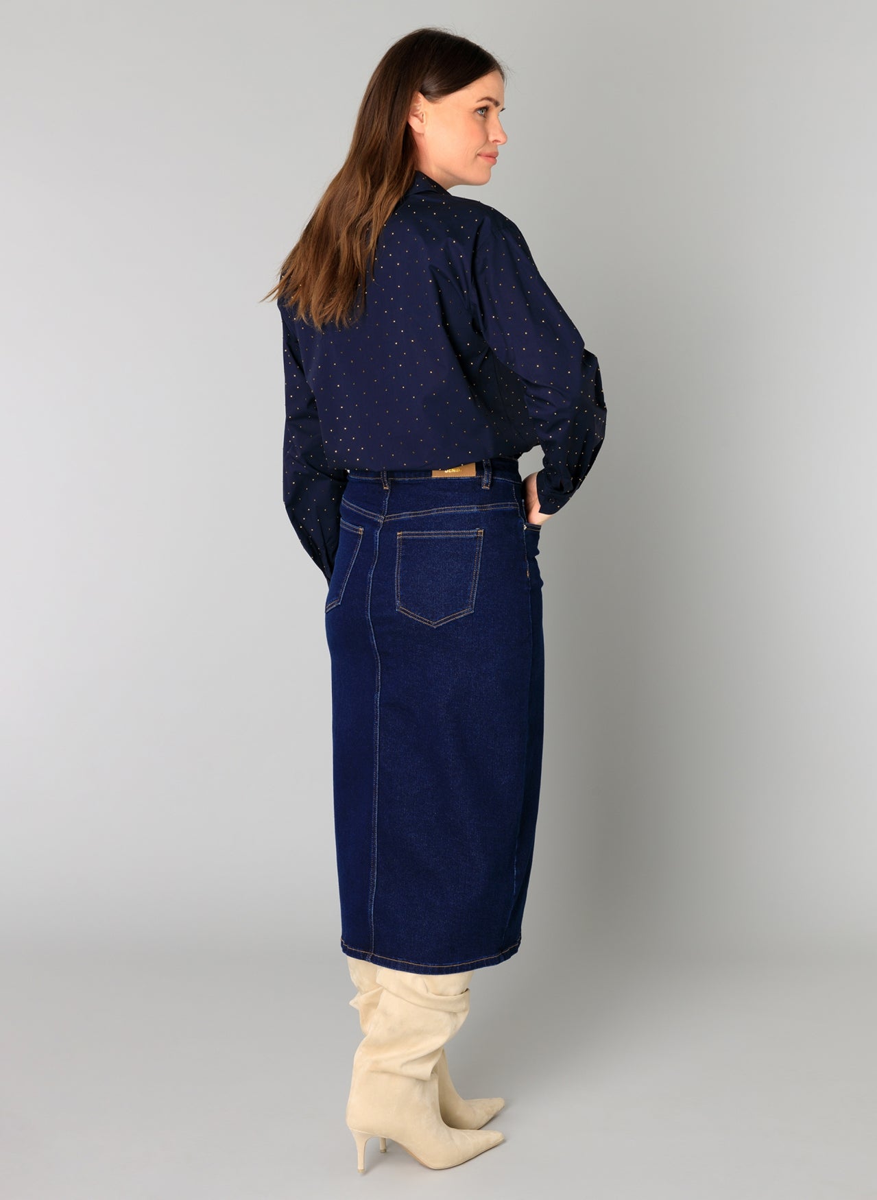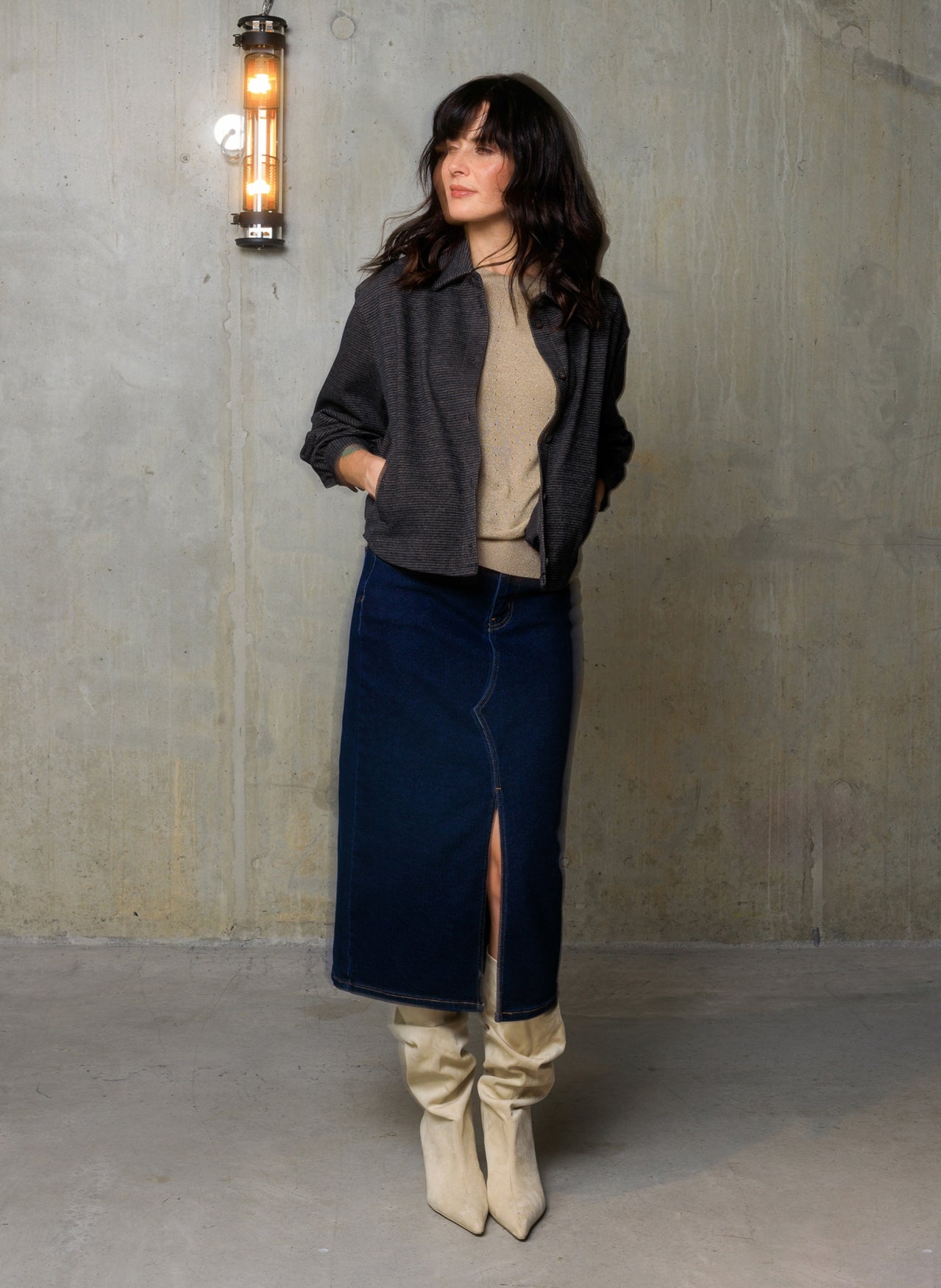 This slim fit denim skirt is made with comfortable stretch fabric, making it comfortable and easy to move with. The large front slit adds a playful and feminine detail, while the classic denim look ensures you can wear it both casual and dressy.