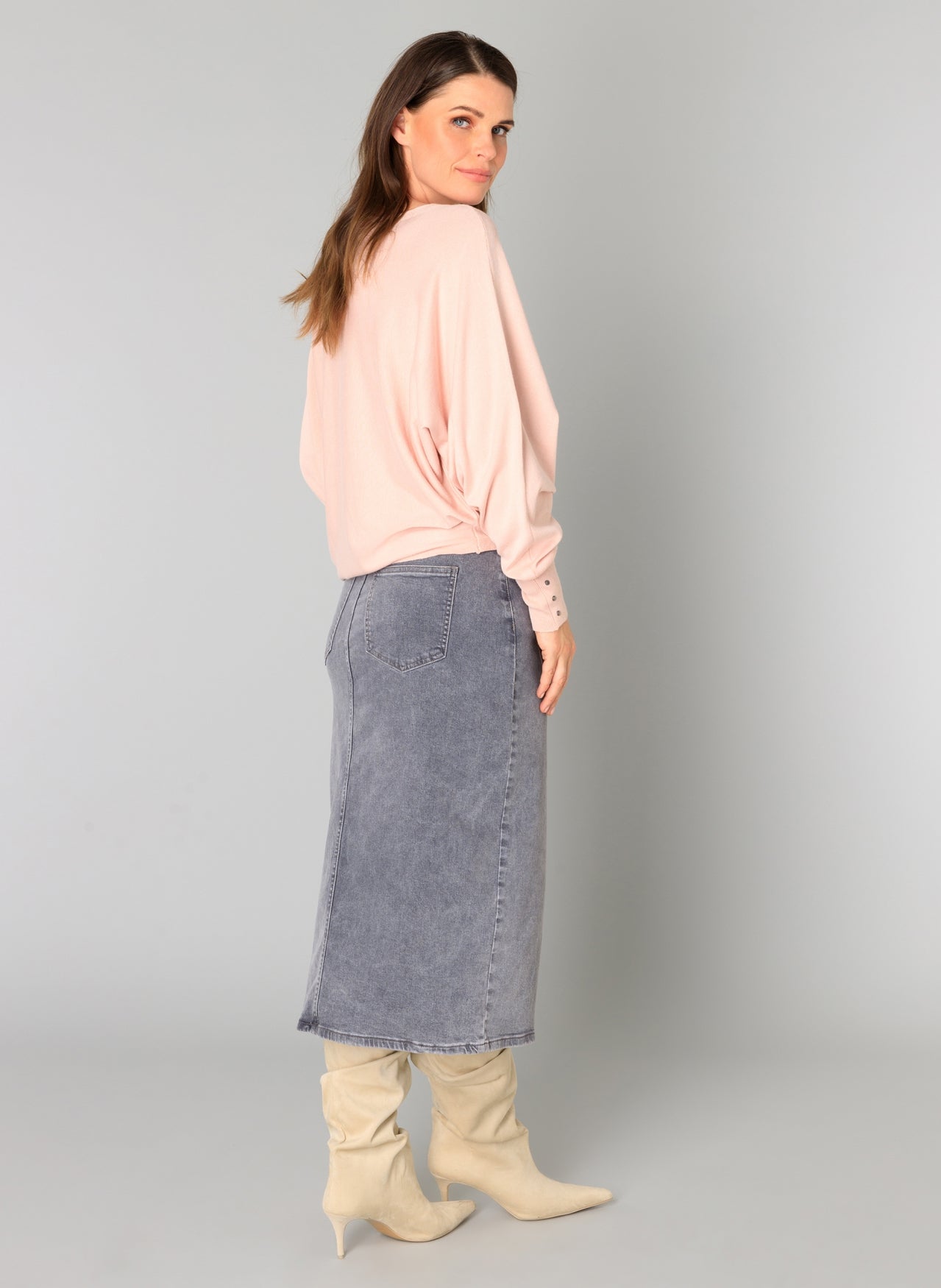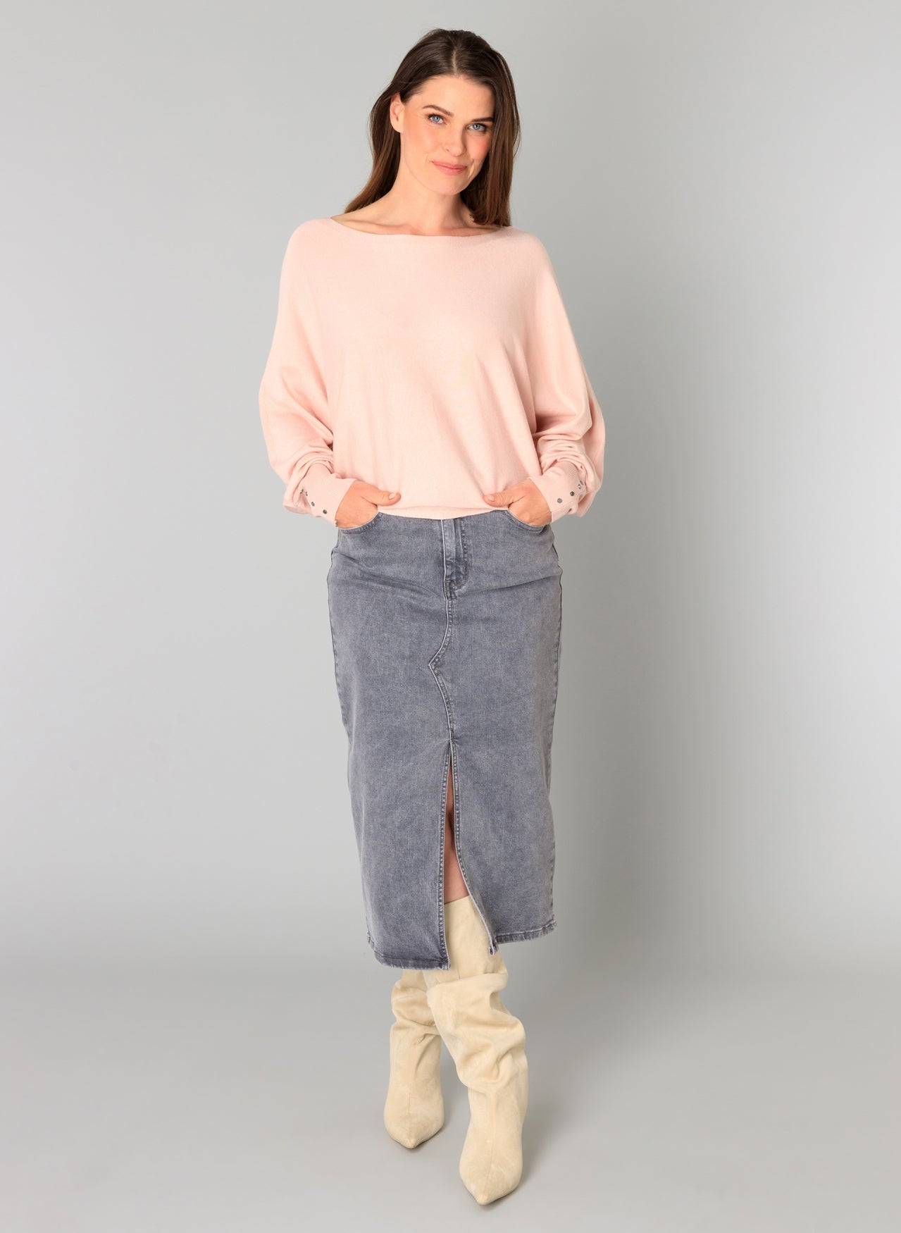This knitted jumper stands out for its beautiful, wide sleeves that elegantly descend into attached cuffs. The soft fabric and boat neck create a relaxed, feminine look. Perfect for casual wear with jeans or slightly more chic with a skirt.