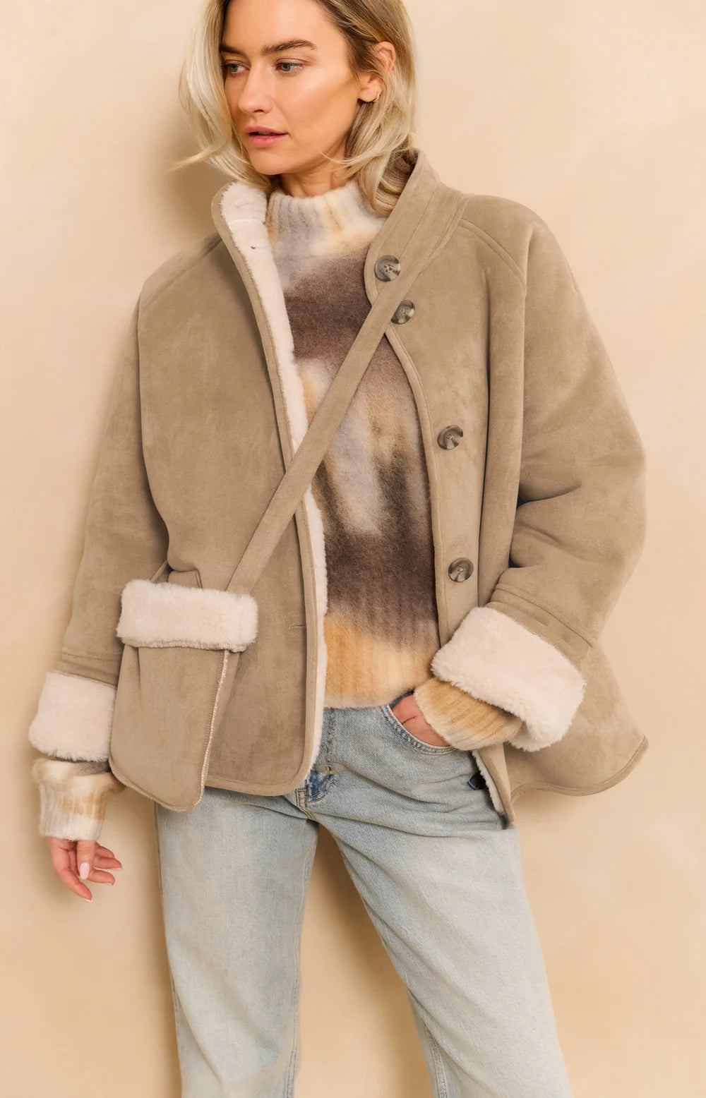 This oversized faux lammy coat is warm and stylish. It features raglan sleeves, a stand-up collar and button closure. The soft lining and turned cuffs add a cozy touch. Crafted from faux suede with a luxurious look. Perfect for chilly days.